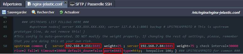 Dans ce cas, vous devez définir des redirections de port personnalisées pour vos backends. Pour cela, passez à la section upstream du fichier de configuration de l'équilibreur de charge /etc/nginx/nginx-jelastic.conf dans votre environnement Traffic Distributor.
