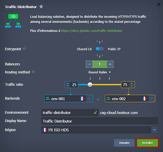 - Backends : sélectionnez deux environnements à équilibrer, soit à partir de la liste des environnements disponibles récupérés automatiquement sur votre compte, soit en saisissant l'adresse IP ou le nom de domaine requis (pour l'hôte personnalisé)