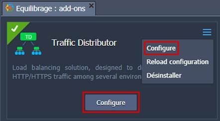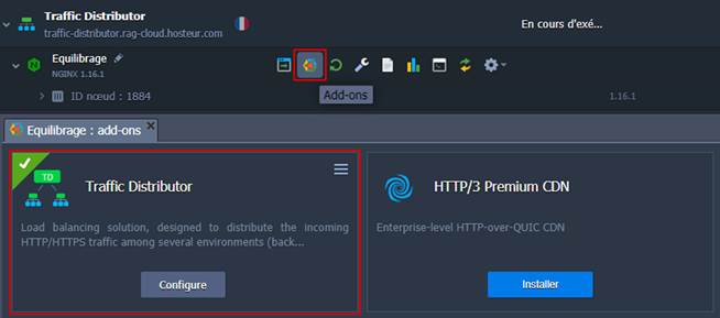 1. Survolez l'instance NGINX dans votre environnement Traffic Distributor et cliquez sur le bouton Add-ons pour ouvrir l'onglet correspondant.