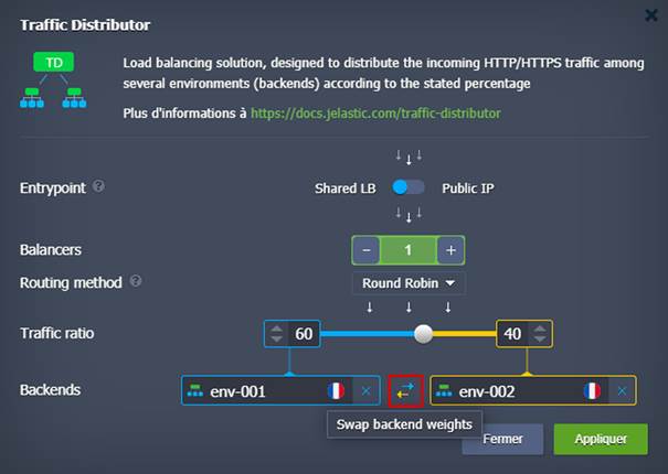 Conseil : en utilisant le bouton Swap backends weights, encadré en rouge dans l'image ci-dessus, vous pouvez rapidement échanger les valeurs du ratio de trafic du serveur.