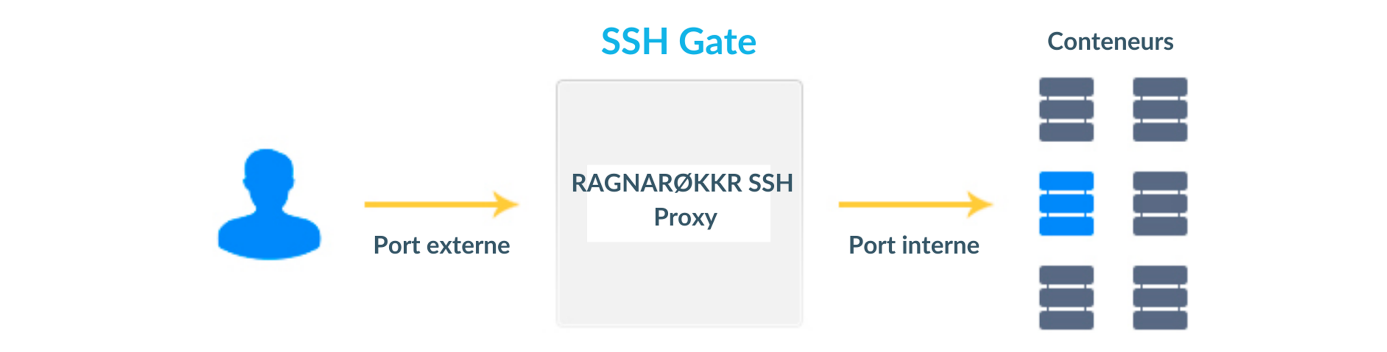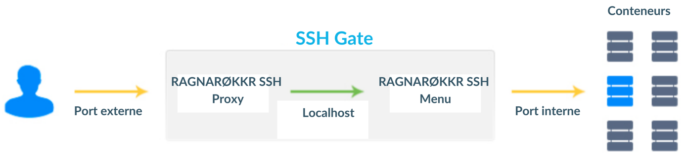 Pour rendre l'accès à la SSH disponible dans RAGNARØKKR, un nouveau composant d'infrastructure a été ajouté au noyau : SSH Gate. La SSH Gate accepte les connexions des utilisateurs à partir d'Internet et transmet ensuite ces connexions au conteneur souhaité, en utilisant un réseau interne.