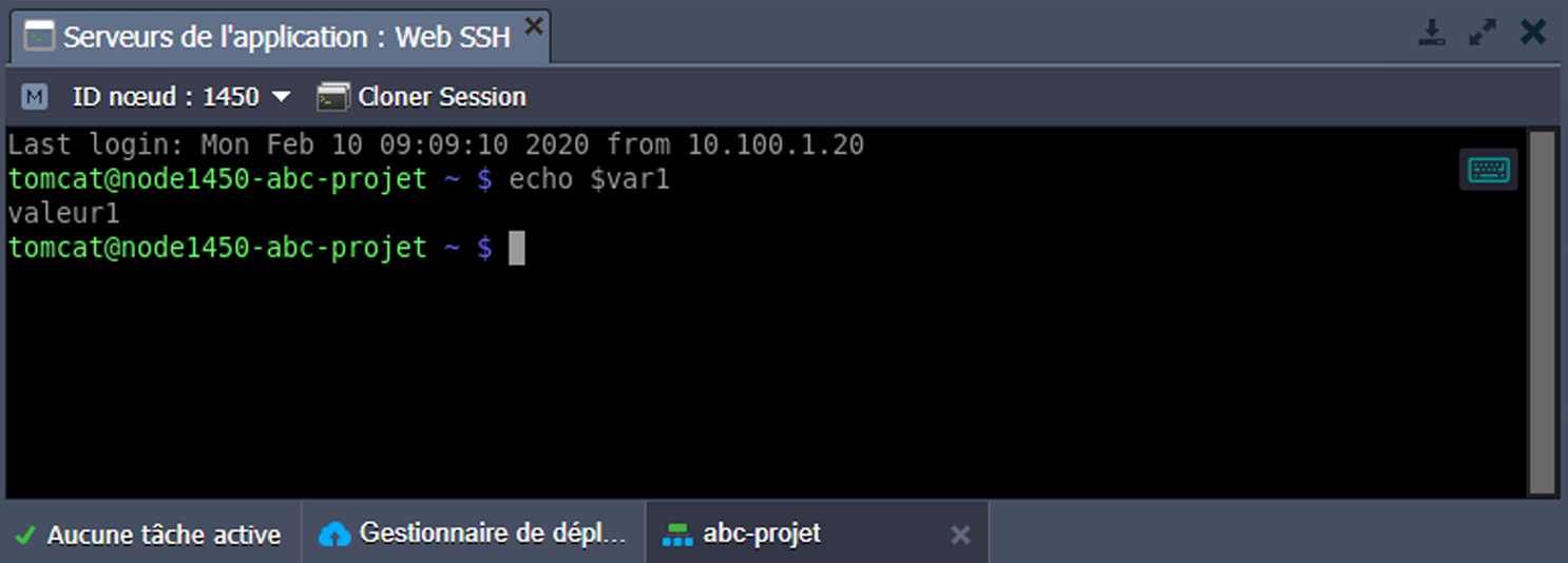 Dans la réponse de la console, vous devriez voir la {VAR_VALUE} similaire à la valeur que vous venez d'attribuer à la variable ${VAR_NAME} dans le fichier .bashrc.