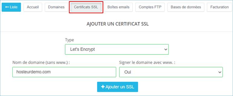 Complétez le formulaire en choisissant comme type de certificat Let's Encrypt.