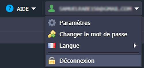 Pour vous déconnecter du tableau de bord, cliquez sur le menu avec votre identifiant (adresse électronique) dans le coin supérieur droit et choisissez l'option Déconnexion.